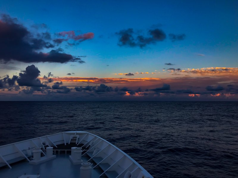 We woke up early in the morning as National Geographic Islander navigated along the northern part of Isabela Island. Slowly the sun appeared above the clouds surrounding Volcano Wolf. We spotted our first birds as Galapagos fur seals returned to shore from their night hunt. We enjoyed a great breakfast. Afterward, expedition leader Vanessa called everyone to the bow to celebrate as we crossed the equator. Our guests happily crossed the line. Approaching Punta Vicente Roca, the visitor site, we spotted Galapagos sea lions and a good number of ocean sunfish. The first activity of the day took place as we dropped anchor at Punta Vicente Roca. This is a spectacular geological site. The combination of the former volcano’s tall cliffs and the tuff cones formed later adds an amazing contrast to this unique visitor site. Our best tools for exploration, our Zodiacs, were lowered down, and off we went to explore the coast. We observed Nazca boobies and blue-footed boobies resting on the small ledges of the tuff cones. Galapagos sea lions swam close to our Zodiac, and Galapagos penguins rested on a broken piece of the tuff cone after feeding. What a wonderful sight! In a calm area, we found a good number of Pacific green sea turtles. The morning’s activities ended with snorkeling. Pacific green sea turtles, plenty of colorful fish, Galapagos marine iguanas and flightless cormorants surrounded us. It was a phenomenal experience! The ship was repositioned toward Fernandina Island. The youngest island of the archipelago, Fernandina is a highlight of our expedition. This island shows our guests the beginning of life. We observed animals thriving in the hostile environment. Pioneer plants like lava cacti grow on the lava fields, breaking down rocks little by little to create soil for the next generation of plants. Punta Espinoza is known for its huge colony of Galapagos marine iguanas. It is hard to distinguish the iguanas from rocks since they are so dark in color. On the other hand, colorful Sally Lightfoot crabs added contrast to the young, dark lava fields. We ended our walk as the sun was setting, returning to the ship with great memories. It was a fantastic day in the western part of the archipelago.