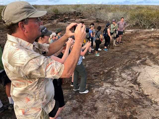 Our adventure began with a wet landing on a white coralline beach inside Darwin Bay, named by a celebrity visitor, William Beebe, in honor of a great naturalist who re-directed human thought, Charles Darwin. We walked over the platform at low tide, surrounded by birds of all kinds, observing their behavior and interactions. It was moving to see these active and attentive parents, caring for their chicks and juveniles in hopes that they will be able to fend for themselves.