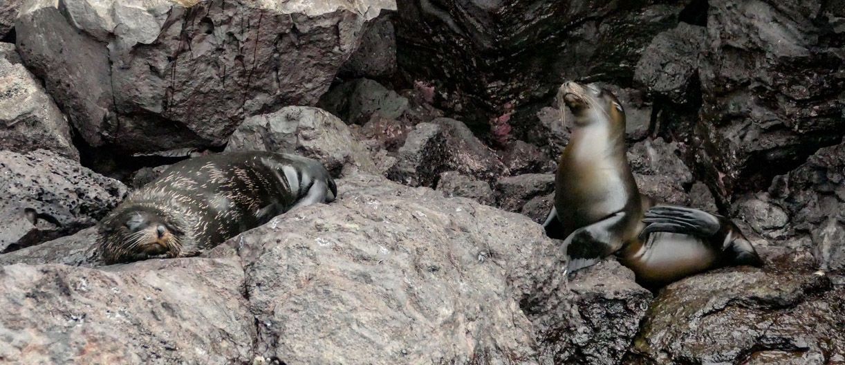 At the base of the cliff, a small colony of Galapagos fur seals reside. We were fortunate enough to find a young Galapagos sea lion – about 2 years old, on a rock right next to an adult Galapagos fur seal. Perfect conditions for a bit of comparison between two completely different genera of marine mammals.