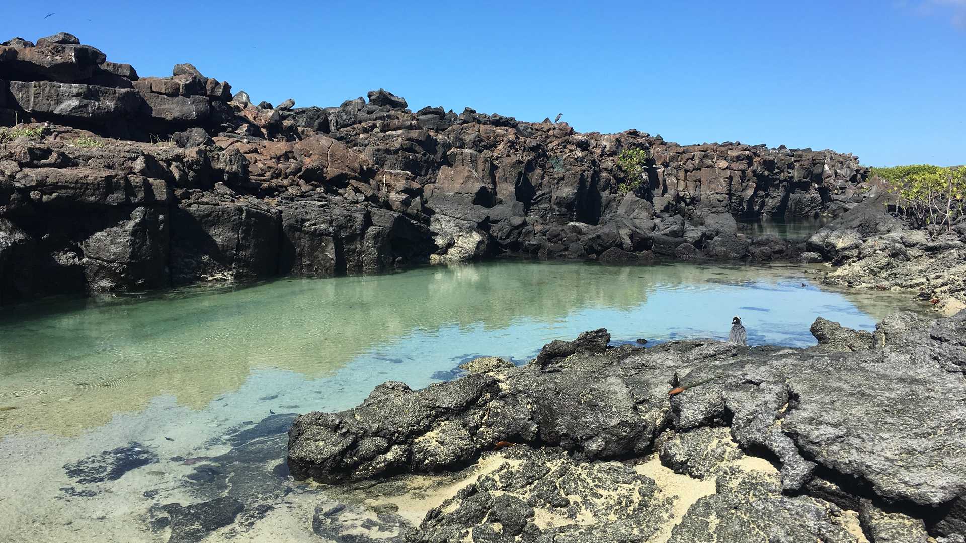 The first place we visited today was Darwin Bay beach, colonies of red-footed boobies, Nazca boobies and great frigate birds were waiting for us at this place. Hiding on the crevices of the lava rocks, we encountered a few yellow crowned night herons, and a small colony of Galapagos sea lions could be seen lying on the sand.