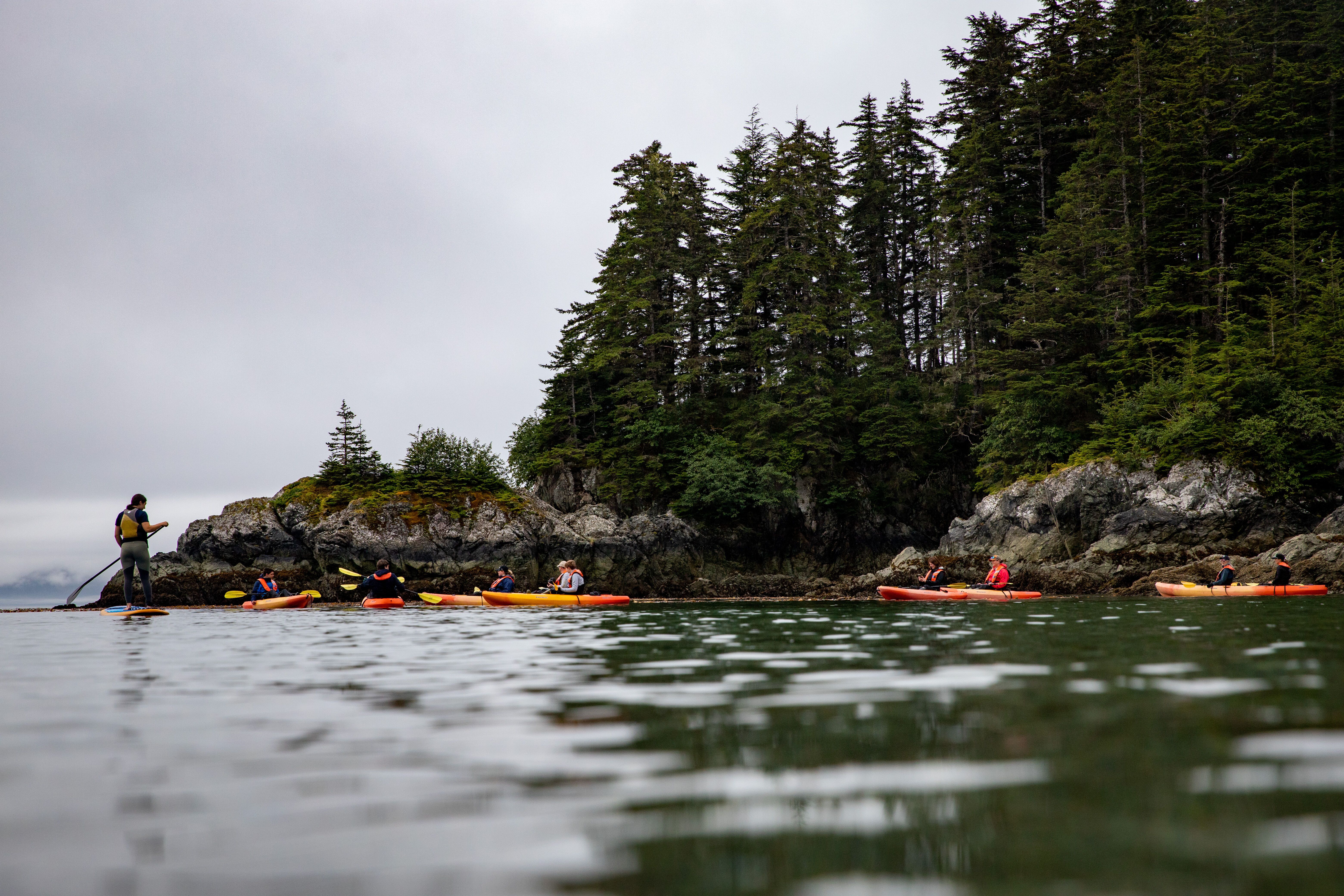 The voyage continues. After navigating through the Lynn Canal and then west to where the Cross Sound and the Gulf of Alaska meet, we anchored in Granite Cove, where our adventures began. In true Lindblad form, we rode Zodiacs from National Geographic Sea Bird to George Island, a former outpost during World War II. Just as we stepped onto the rocky shore, the clouds parted, and sunshine beamed upon us as if to welcome our exploration. Groups set out by foot and by kayak to take in the sights. We found a multitude of colorful lichens in the forest, seaweed on the beach, and sea stars in the tidal zones. No matter where we explored, we were bound to get great photos. Back on board, there was a buzz of chatter during lunch as we compared notes on what we saw. A quick repositioning of National Geographic Sea Bird brought us to “the Hobbit Hole” in the Inian Islands archipelago. Here, the color of the water is a striking teal. It’s the only entrance for the Pacific Ocean to pour nutrient-rich waters into the northern reaches of Southeast Alaska, so the chances of seeing marine mammals and seabirds are good. The afternoon Zodiac runs did not disappoint. We saw sea otters, harbor seals, rhinoceros auklets, and bald eagles…oh my! As we headed back to the ship in our Zodiacs, a light, cool drizzle began and gave way to a brilliant rainbow, uninterrupted by the buildings, traffic, or crowds we’re accustomed to. Lucky for us, we have a couple more days for moments like this one on our floating home.