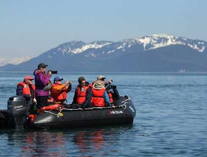 Meanwhile, others kayaked in the interesting bay, where birds were seen in caves. And even others preferred to be taken in expedition landing craft around the island, enjoying its broken rock character.