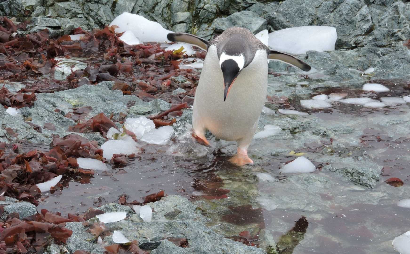 We spent the morning at Georges Point, which is a rocky point on the northern end of Rongé Island, which itself is located near the western entrance of the Errera Channel. This is an important nesting site for both chinstrap and gentoo penguins. It was interesting to see that their nesting colonies are adjacent to each other, but not intermixed. However, at this time of the season, many of the larger chicks are out of their nests and have become completely intermixed as they chase their parents begging for food. It was a little slippery at the landing site as we walked carefully over algal-covered rocks, and it was amusing to watch the penguins carefully maneuver through this area just as we did. Everyone was fascinated by the complex penguin highway system. It seemed to work perfectly, in spite of the fact there were no traffic signs or traffic cops in sight.