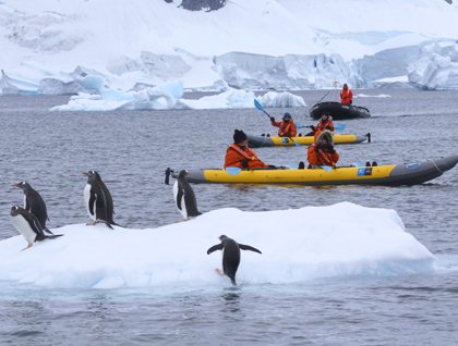 By the afternoon, National Geographic Orion, our floating home, was at anchor off of the Danco Coast where our fleet of kayaks was made ready. Icebergs, Gentoo penguins and Weddell seals made the scene. The beauty of self-propulsion gave each of us the opportunity to find our favorite place and our own unique perspectives. The seals seemed to completely ignore us as they basked on the emergent rocks. The gentoos were busy bathing and popping out of the water, on to growlers, and back into the water. Some even followed us, clearly curious about our yellow boats.