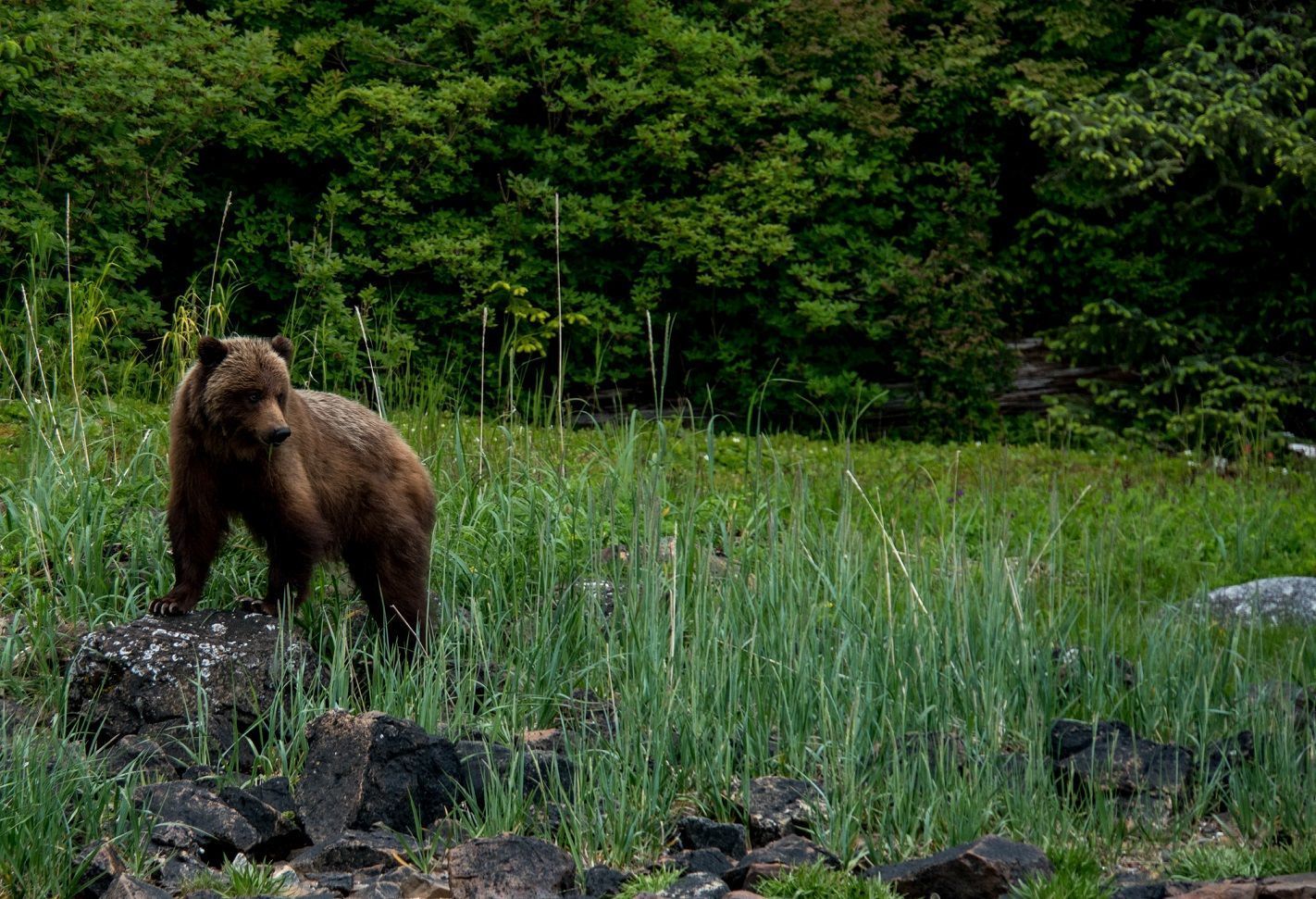 During the morning, we explored the scenic cove of Pavlof’s Harbor on the southeast shore of Freshwater Bay, Chichagof Island, and area known for its healthy salmon stream. We were optimistic that we might still see a bear during our last day exploring Southeast Alaska. We were not disappointed! At the base of a small waterfall, we spotted a coastal brown bear casually gorging itself on salmon as we watched, spellbound, from the safety of our expedition landing crafts only a few yards away. The bear, enjoying its meal, seemed oblivious or at least indifferent to our presence. For nearly an hour, we watched the animal devour fish after fish until it calmly walked up the river bank rocks and into the forest. Late summer and early fall is the time to fatten up and prepare for the long winter ahead. Come November and the onset of snow, brown bears will leave the coastline and head to higher elevations near or above treeline. Biologists debate whether bears truly hibernate or just den up and sleep during the winter. Pregnant sows will give birth to tiny, one-pound cubs while sleeping within the den and nurse them until spring. We returned to the ship after our morning adventures for lunch and were relaxing in the lounge when another bear was spotted on the beach south of Pavlof Harbor. Although more distant than our first encounter, we all enjoyed another exceptional sighting of a coastal brown bear. But the wildlife viewing wasn’t over yet! As we sailed south along Chatham Strait, we encountered a pod of killer whales swimming nearby. Crusing alongside the pod, we counted a group of about ten that included one large male. His large dorsal fin rose nearly six feet above the water‘s surface. Guests spent the remaining time reading or chatting with friends. We wrapped up our day with the captain‘s dinner followed by the guest photo slideshow, which we enjoyed as we sailed toward Sitka through Peril Strait. Have we seen it all? Hardly! But we left with a sense of fulfillment, knowing that we saw a lot! And maybe one day we‘ll return and finally see some elusive moose!