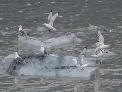 Heading into the heart of Glacier Bay, Marylou and Irene oriented us to the park and provided us with a base of natural and cultural history. Turning into Tidal Inlet tour ship slowed, a sign that something of special interest might be at hand. Ready with cameras, binoculars and anticipation, we gathered on deck to watch a brown bear working its way along the barnacle encrusted rocks lining the shoreline. Followed by northwestern crows looking for an easy meal, the bear turned over large rocks looking for tasty treats. Brown bears are the same species as grizzly bears. Coastal grizzlies are typically referred to as brown bears. With salmon, beached whales and other marine food sources, brown bears are typically larger than interior grizzlies.