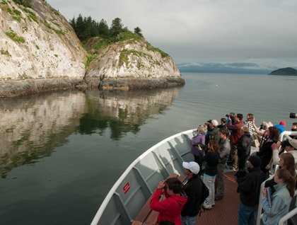 Breakfast was finished just in time to let everyone prepare for South Marble Island, the home of so many seabirds and Stellar Sea Lions. The sea lions are always the most noticeable residents. Their constant barking and arguing among the individuals gives them away even before we reach the island. Soon however, we were seeing our first puffins, guillemots, and murres. Watching the puffins take off from the water is always one of the favorite sights to see. Evolution has not made them the best fliers, and with filled bellies, it takes a long running start before they can active flight. It looks as if they prefer to run along the surface of the water, rather than take flight and escape our approach.