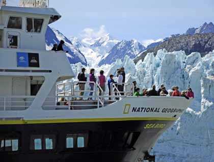 The calving at Margerie Glacier, our first tidewater glacier of the trip, was spectacular—large pieces of ice dropped off the face several times while we waited joyfully and the National Geographic Sea Bird rolled gently in the swells produced by the calving events. Above the blue ice face were 10,000-foot peaks in the Fairweather Range—the high elevation source of snow and ice for this stable river of ice.  What a day to remember.