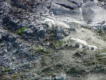 Just around the corner from tidal inlet is a remarkable outcropping of rock known as Gloomy Knob. Here we found in abundance another signature animal of Glacier Bay—mountain goats. We spotted eight altogether, including several nanny kid pairs lounging in the grass as sunny skies began to emerge. Also emerging from the clouds was the glorious spectacle of the Fairweather Range with peaks rising higher than 15,000 feet almost immediately above the sea in the bay. However the scenic highlight of our journey was a trip into Johns Hopkins Inlet. At Jaw Point we were able to look five miles straight down an ice-choked fjord to the face of Johns Hopkins Glacier and marvel at the ice clad mountains rising vertically above.