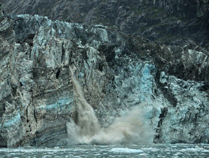 Faith told us about the cultural significance of Glacier Bay as we cruised across the west arm of the bay towards the entrance to Johns Hopkins Inlet. This was the first time this season that National Geographic Sea Lion had gone into the inlet. Immense mountains rose steeply above us, their jagged tops peeking through shifting clouds. Numerous glaciers hung suspended in their valleys, blue and mottled with rocks. We picked our way through icebergs that led us like stepping stones towards the face of the glacier. Johns Hopkins is the most active glacier in the park, and her mile-wide face did not disappoint. Ancient ice fell with thunderous booms into the water, sending splashes hundreds of feet into the air.