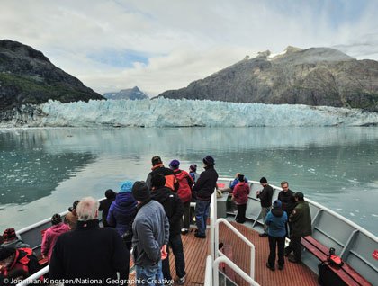 A cold icy wind greeted the guests of the National Geographic Sea Bird this morning as we made our way into Johns Hopkins Inlet and past Jaw point in Glacier Bay National Park.  The Johns Hopkins Inlet is closed for most of the season due to heavy pack ice and seals pupping their young—so it is a real privilege to be able to visit this area of the park. As the temperatures began to rise and the ship approached the face of the Johns Hopkins glacier, it became quickly apparent that the ice pack in the bay was too dense to navigate any closer and still allow time to visit other areas of the park, so the decision was made to reposition the ship to the beautiful Margerie and massive Grand Pacific Glaciers while the guests enjoyed a warm breakfast of crepes compote, fresh fruit, and all the bacon, eggs, and oatmeal a small army of cold photographers could eat.
