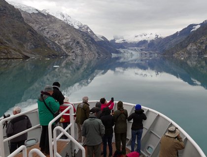 This jewel in our national park system is a place of change and movement. At dawn, we began to witness that movement with a bit of calving in front of the Margerie Glacier’s mile-wide icy face. As the morning progressed, we moved south past smooth bare rock and piles of moraine to areas partly covered with mosses and black cottonwood trees changing into autumn’s gold. Sitka alder shrubs with their life-giving nitrogen nodules clung to cracks and level spots along the rocky fiord walls, and soon dark green Sitka spruce spiked the horizon.