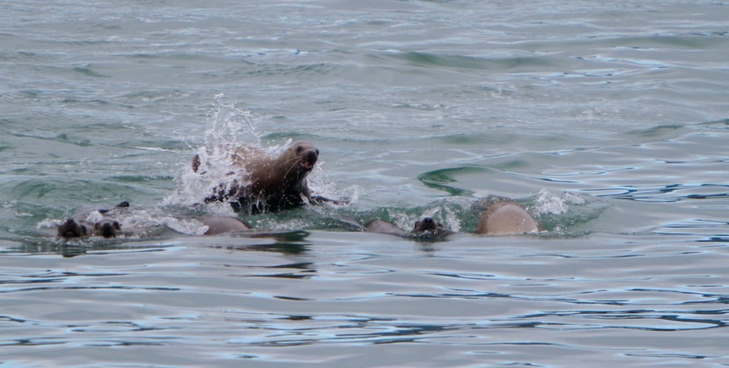 Following in the footsteps of John Muir we continued deeper into the glacially carved fjord and were rewarded with more wildlife encounters. High up in the alpine scrub beyond the tree line, a keen-eyed naturalist spotted a group of mountain goats, which began quickly moving across the rugged terrain. The reason for their haste soon emerged: a brown bear worked its way towards them before realizing she had been spotted and disappearing over the ridge. In the deep waters around the ship sea otters laid on their backs tending pups or hammering open bits of crabs on their bellies. Passing Gloomy Knob, a dramatic outcrop of marble studded with fossilized marine material, we came across another group of mountain goats with two nanny goats and two kids perched on the rocky cliffs above the water. Beyond Queen Inlet, a pair of young brown bears wandered along the intertidal foraging barnacles and other invertebrates before disappearing into the vegetation.