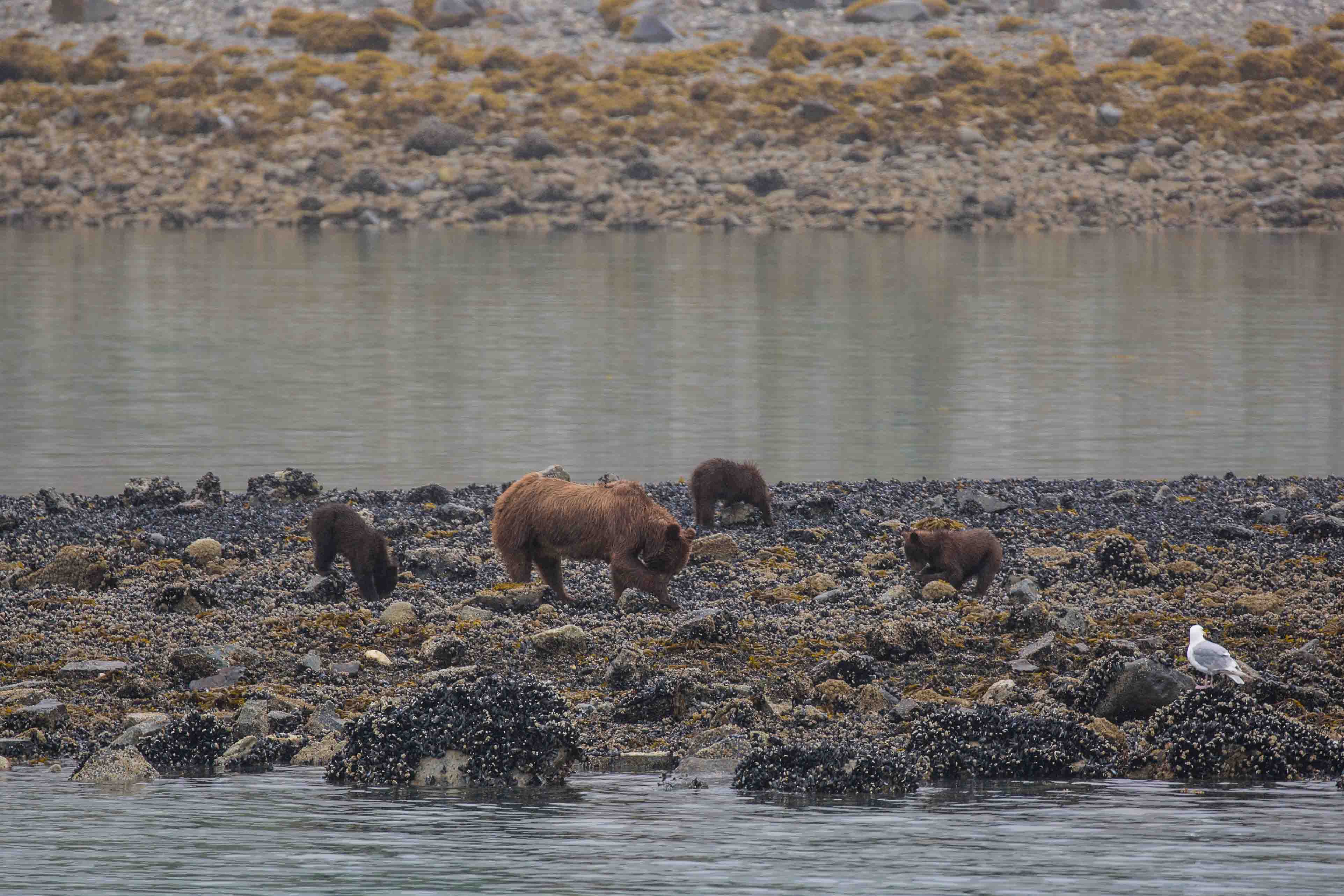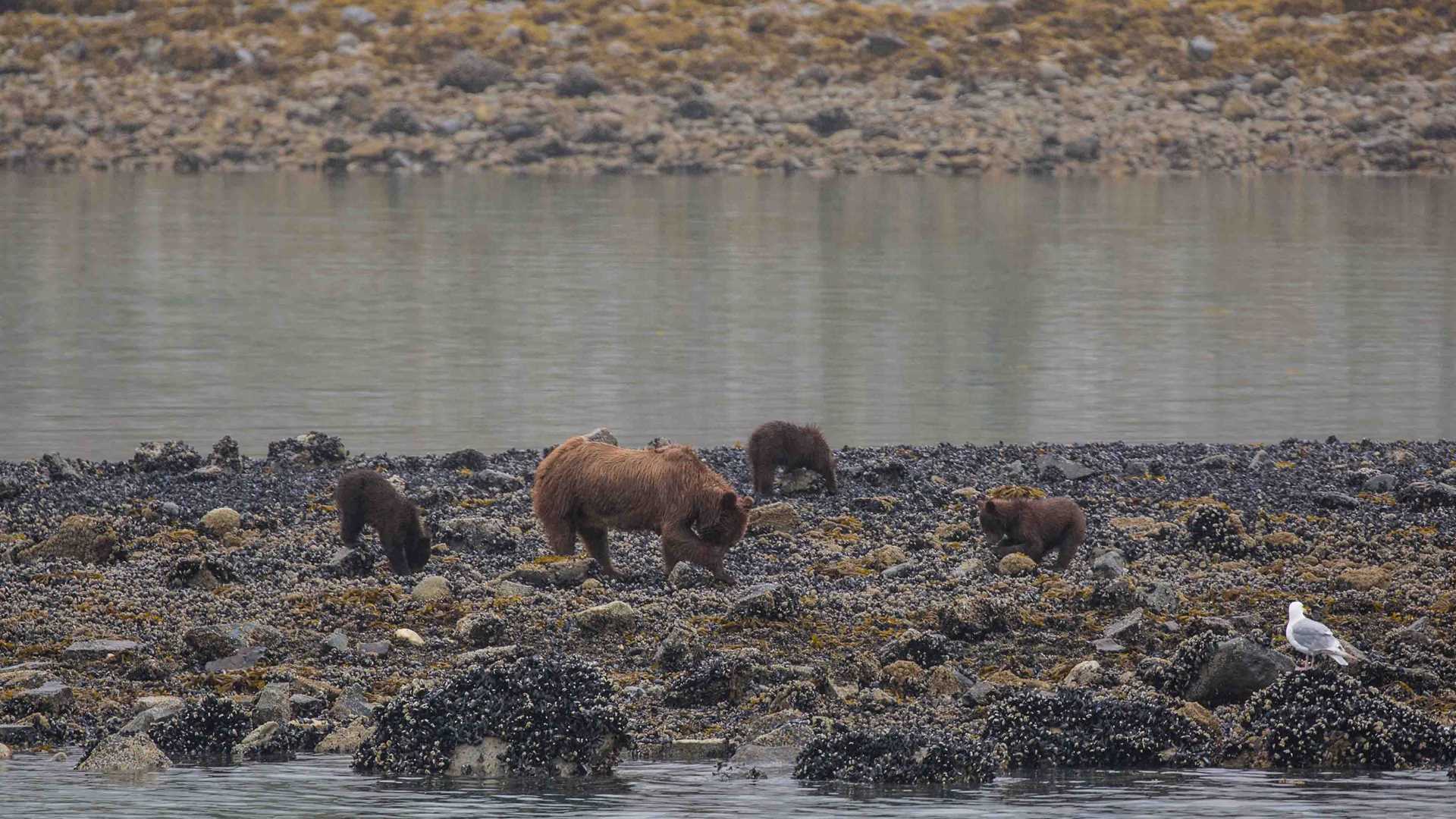 Today dispelled the notion that one needs a blue sky to have an amazing day. Despite mist-shrouded forests and fog-covered peaks, out journey through Glacier Bay National Park today showed us so much that any less cloud cover might have been overwhelming. After several close up looks at brown bears foraging along the intertidal zone, one of which providing a perfect example of the fact that some brown bears can be black in color, a sow and her three cubs were spotted on the beach.