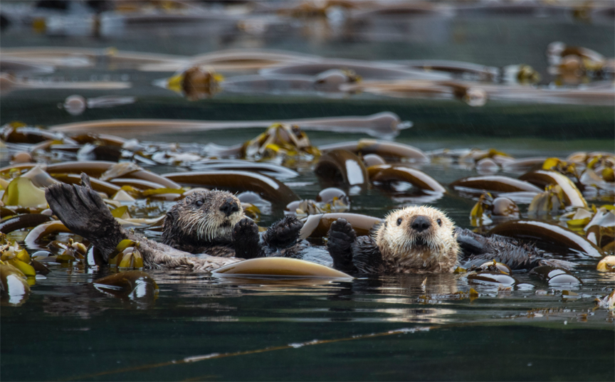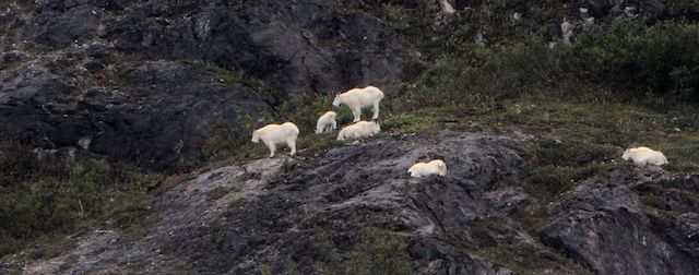 After breakfast we continued to the Lamplugh glacier to admire its stunning blue hues before continuing southward in search of wildlife. On our way to Russell Cut we passed two icebergs drifting from the nearby glaciers onto which sea otters had hauled out to groom themselves. Farther along what at first appeared to be a flock of birds in the low fog revealed itself to be an enormous raft of nearly 30 otters all huddled together in the middle of the bay. As we approached the dramatic dolomite cliffs of Gloomy Knob we spotted flocks of surf scoters and tufted puffins with their candy corn bill diving in search of food near the shore. As the low-lying clouds thinned a small group of mountain goats appeared high on the cliffs above.  Three goats quickly became six, then ten, then 14 as we honed our search image for these well-camouflaged mountaineers.