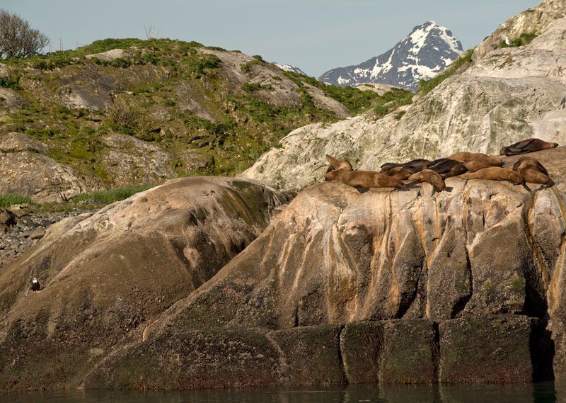 The National Geographic Sea Bird arrived at the main dock in front of the Glacier Bay National Park lodge early on a crystal-clear spring day. Temperatures were quite cool but the skies were clear and we could see for miles! After the park service rangers and Tlingit interpreters boarded our vessel, we began our journey north up Tarr Inlet for a day exploring a small section of the national park’s 3.3 million acres. Throughout the day, Ranger Patrick and tribal member Joe Valle made several presentations, and also joined us on the bow as the Sea Bird cruised over a hundred miles round-trip within Tarr Inlet. We stopped at four tidewater glaciers, took a quick look at Tidal and Geikie Inlets, and spent time searching for wildlife on land. Along with mountain goats at Gloomy Knob, we also saw several brown bears and one very large black bear! We encountered several large rafts of sea otters, including mothers and babies, who continued to scoot out of the way as the Sea Bird maneuvered. After Recap and dinner, the Sea Bird positioned back to Bartlett Cove, and many of us enjoyed sunset walks. In the last light of day, we made our way through a newly formed coastal temperate rain forest, watching the sun set on the Fairweather Mountains on the west coast of Glacier Bay National Park.