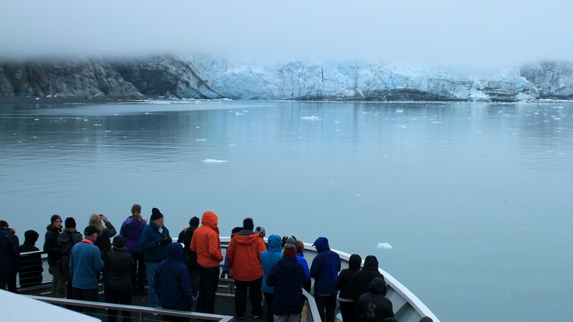 We woke up to today to sculptures of ice floating down the mirror-still water of a mist filled fjord as we proceeded towards Johns Hopkins Glacier. The air was crisp and still holding only a slight chill. The dramatic landscape unfolded in front of us, showcasing countless waterfalls spilling from the high walls of the fjord and complex structures of ice at the face of the glacier. Kittiwakes streamed by silently in the morning air as seals gave us a curious glance.