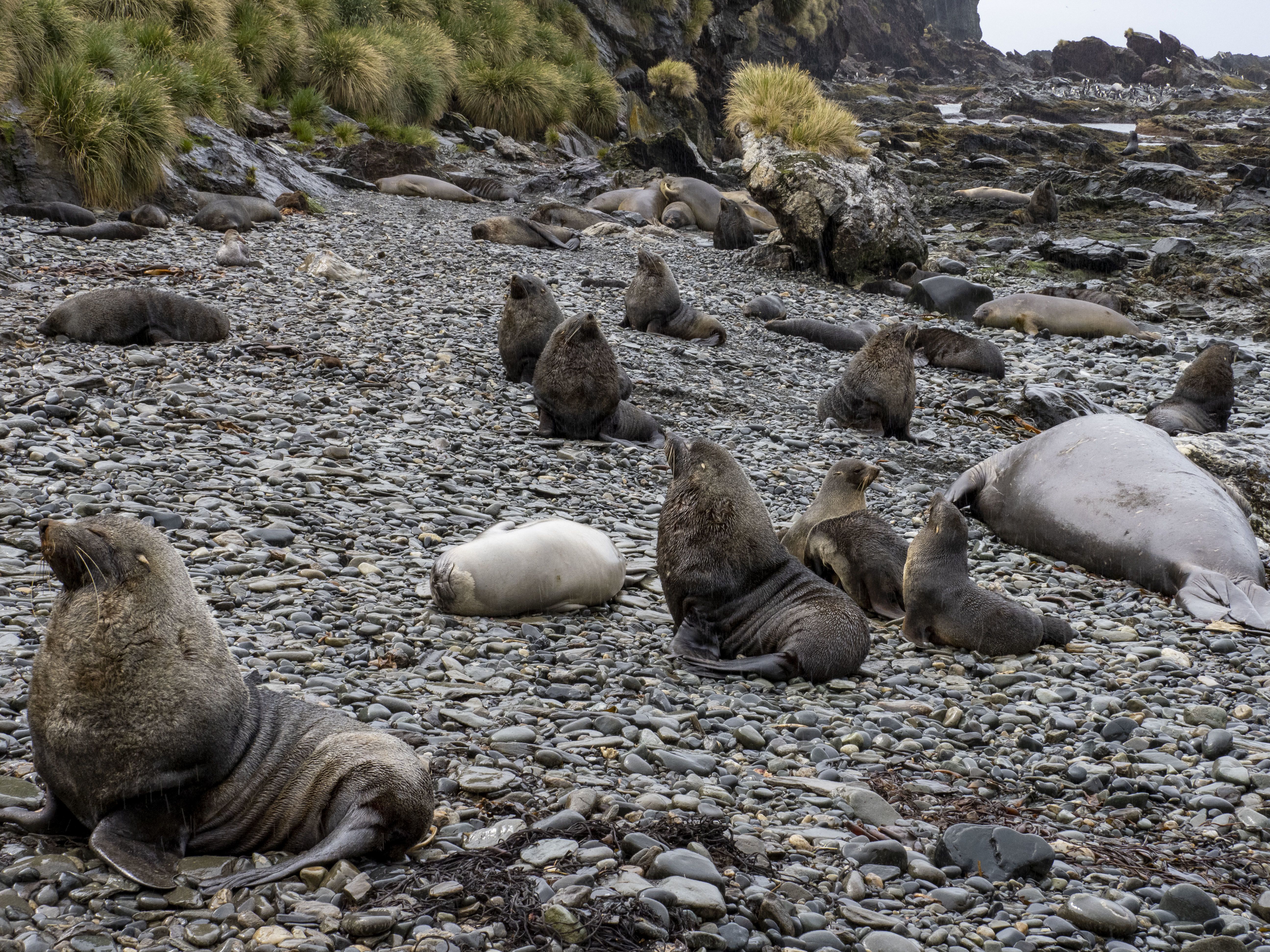 Late afternoon brought us to the Bay of Isles with a lovely Zodiac cruise amongst beautifully lit rocks with snoozing fur seals, beaches heaving with jousting male Antarctic fur seals and a few harems and newborn pups, and a host of seabirds. The giant petrels were the most numerous but even in a short amount of time, we spotted prions, South Georgia pintail ducks, shags, skuas, gentoo and king penguins, and a few lucky overhead soaring passes from one of the resident wandering albatross.