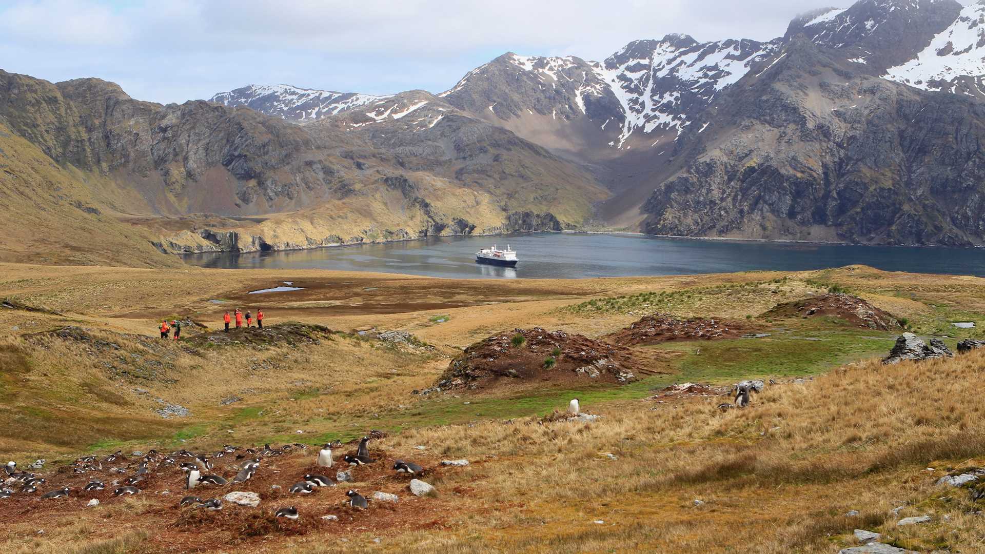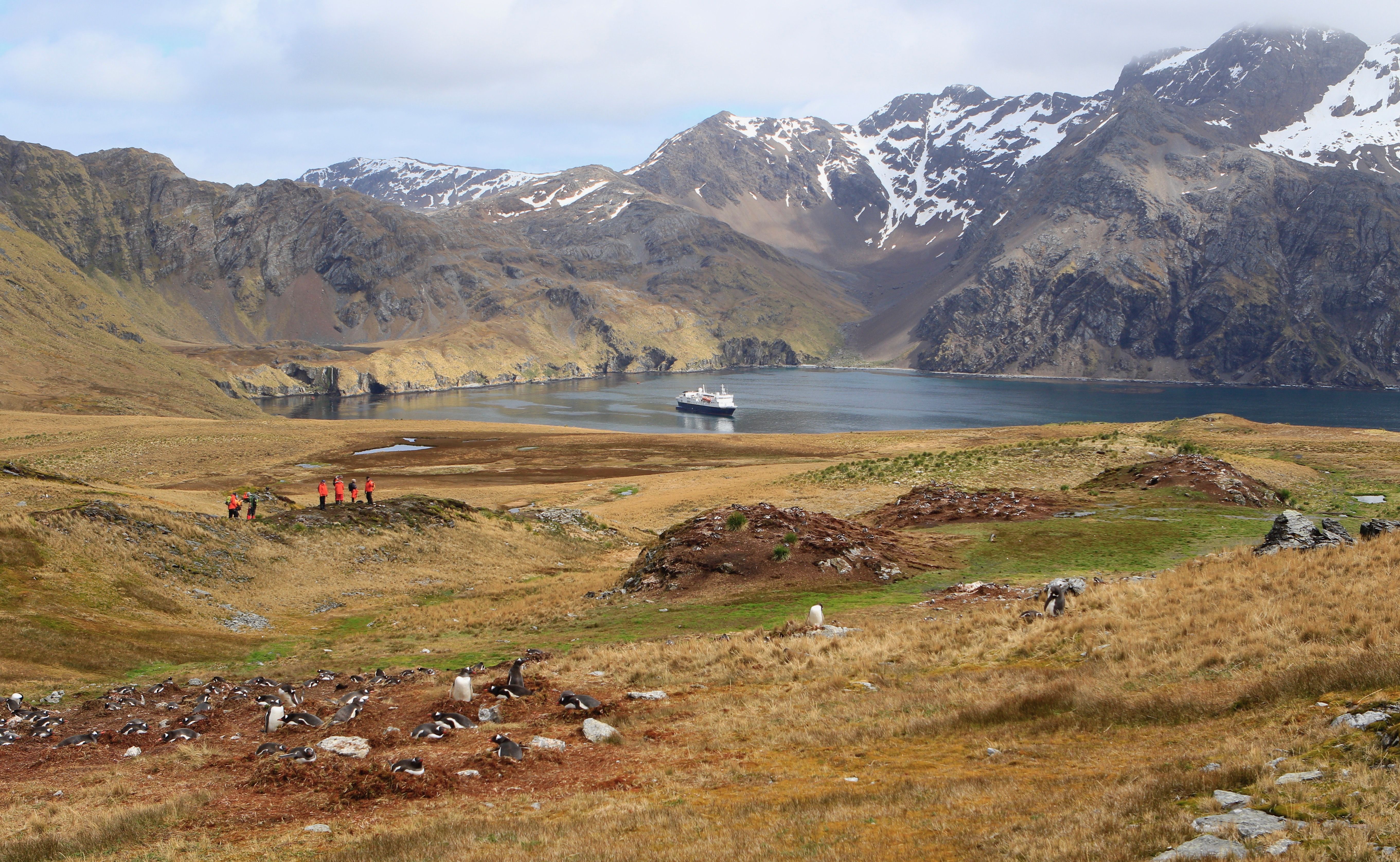 This morning the National Geographic Explorer woke up on the hook in Jason Harbor in Cumberland Bay to an absolutely stunning day. The Allardyce Range was in full sun and as we pulled away from our anchorage we were exposed for the first time to the rugged nature of the mountains, which make this island in the Subantarctic so dramatic. Continuing down the coast we pulled into Godthul (meaning Good Cove in Norwegian) and pursued our preference either on foot or Zodiac. At the landing, we encountered evidence of bygone whaling days and the remnants of the floating factories that operated in Godthul from 1908-1928. As we negotiated our way up through the tussock we encountered the occasional snarl of the fur seal and were glad when we got out of the thick grass for ease of walking and absence of the eared seal with a territorial disposition. As we emerged to more open country we discovered evidence of reindeer that have since been eradicated. In 1911, ten animals were introduced to nearby Ocean Harbor on the Barff Peninsula as a reminder of home for the Norwegian whalers and for hunting. Unfortunately the three reindeer introductions on South Georgia were in some of the most biologically productive areas and by 2000 it was realized that the reindeer must go. After eradications in 2013 and 2014 the reindeer, like the rats, are considered to no longer be present, albeit the monitoring continues. Climbing further up, the hikers had incredible views of the surroundings (and gentoo penguins) while those in Zodiacs enjoyed the incredibly rich shoreline of Godthul.