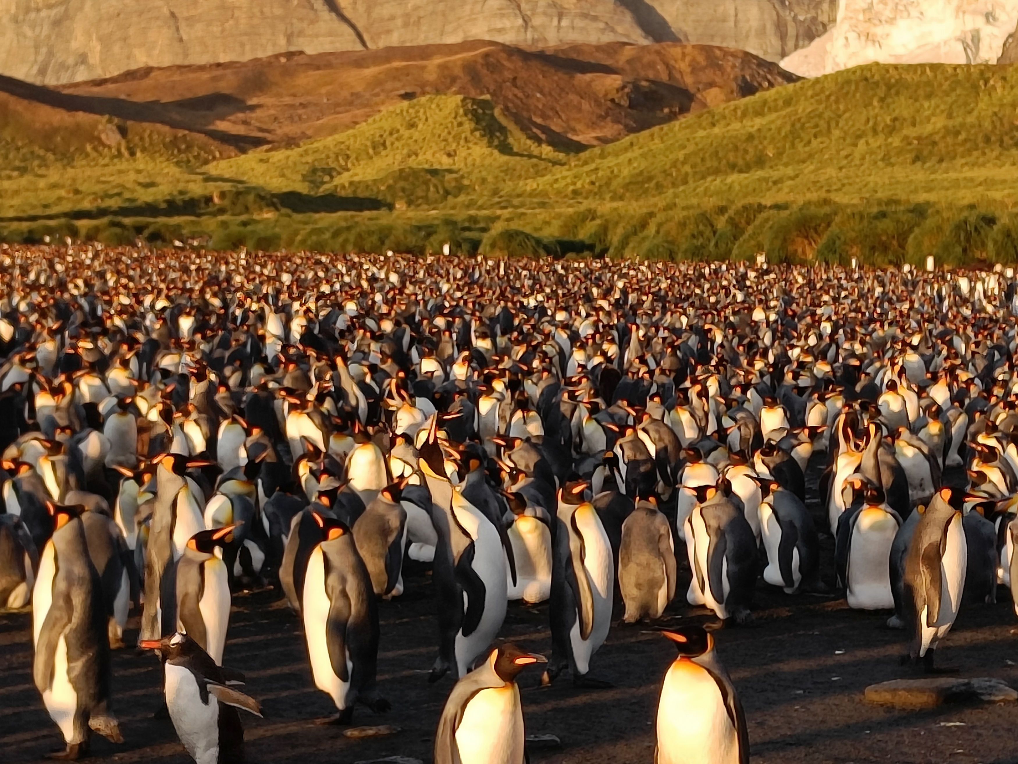 It was a tremendous last day in South Georgia – filled with awe-inspiring scenery, wildlife, and some exciting surf! We started the day before dawn as expedition leader Doug assessed conditions at Gold Harbour beach for our early morning landing. There were large openings in the clouds on the horizon and very calm breezes, which were promising signs for a successful operation ahead. We headed to shore as the sun started to peek through the cloudscape. Within an hour, the wildlife ashore (as well as our keen guests ashore) was bathed in a soft orange glow. The king penguin colony burst into song and vibrant color, and the air was pierced with the bellows (and stench) of molting male southern elephant seals, which were piled upon each other on the shore.