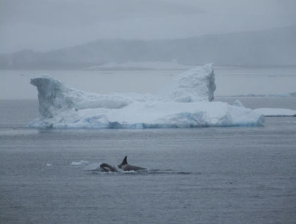 Then it was back to the ship to warm up, but before the evening ‘recap’ talks began, Lucho, the expedition leader, announced that there were Killer Whales off the bow. No time for talks, everyone grabbed binoculars and cameras and went to any vantage point they could find to watch these magnificent creatures as they cruised through the ice flows. We have two Killer Whale scientists onboard, and along with Lindblad naturalist Stephanie Martin as Zodiac driver, they approached the whales in the hope of fixing some tags on them with a cross bow.