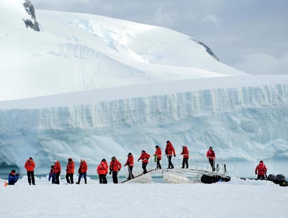 During the early morning we had just reached Prospect Point, the southernmost point of this expedition: 66°00.7´ South and 065°20.4´ West (just slightly north of the Antarctic circle). Now we are heading north. MS National Geographic Explorer anchored just before breakfast at one of the Fish Islands. After breakfast a Zodiac cruise was offered. The sea was dead calm. From the Zodiacs we saw a colony of Adelie penguins, several Crabeater seals were hauled out on small ice sheets, and brown skuas, blue-eyed shags and Antarctic terns were observed. The many impressing icebergs caught our attention more than anything else. Skylar (8), our youngest passenger, liked what he saw.