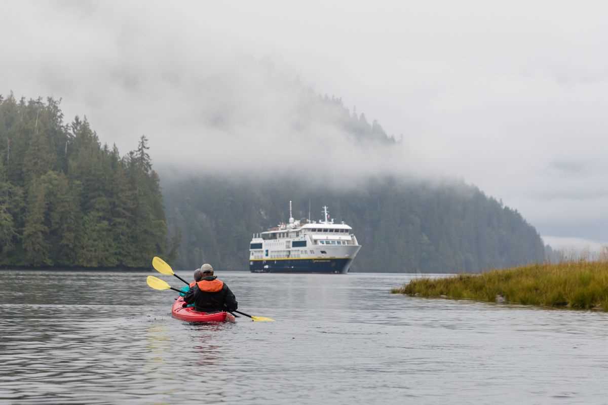 Morning mist reveals a broadly tiered waterfall, and early risers are rewarded with a brief observation of two black bears at the edges of the cascade. Ethereal mist persists as we venture into Green Inlet for a paddle and Zodiac cruise in these placid waters. Reflections of cedar paint the still coves, and the chatter of a kingfisher brings our attention back to the boughs draped in dew. In the afternoon, Chief Mate Sean Kummer spies a peculiar creature drifting at the ocean’s surface. Expedition diver Amy Malkoski quickly identifies it as a Mola mola, or ocean sunfish. It’s fair to say that it’s unusual to see this fish in these waters, yet over the next hour of cruising two more are spotted! A breaching humpback whale rounds out our afternoon of wildlife encounters.