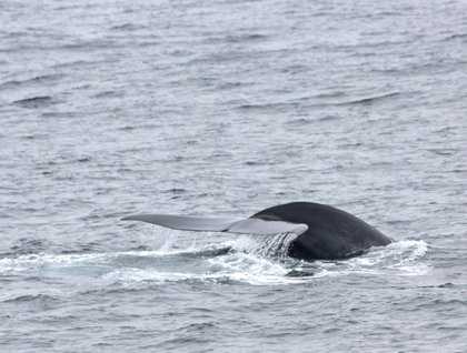 A relaxing day at sea was pleasantly interrupted after lunch by the appearance of a great blue whale in the middle of nowhere in the Arctic seas. This enormous animal proved to be one of the small minority of blue whales that lift their tail up when sounding and we were treated to several surface intervals and fluke-up dives by the feeding giant in gentle seas.