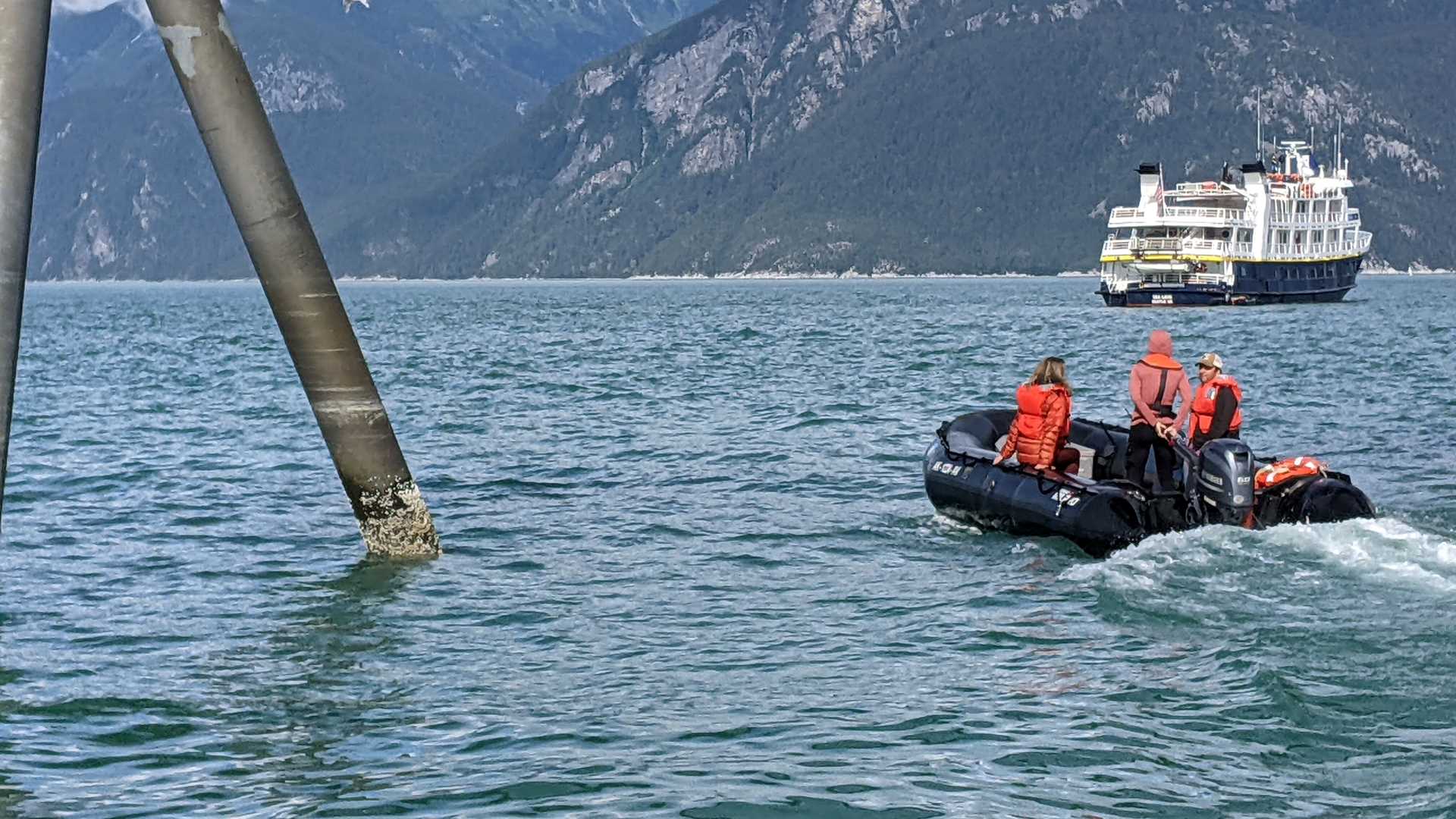 It is always a pleasure to surprise our guests. With such great weather, we were able to cook up a doozy. Upon arrival back to the ship, guests were invited to the sundeck where our hotel staff had set up an outdoor happy hour to allow them to bask in the sunshine and beauty of Haines from the water. Cell phones and cameras were passed around as we all shared stories and photos of our day over drinks. Guests were amazed at the beauty of observing moving glaciers from above. Many never even imagined they might do such a thing. The bicyclers had to stop in their tracks to watch a mother bear and two cubs pass just a few yards in front of them. Don caught a huge pink salmon that pulled him into the stream, causing him to show up to the ship soaking wet and grinning ear to ear.