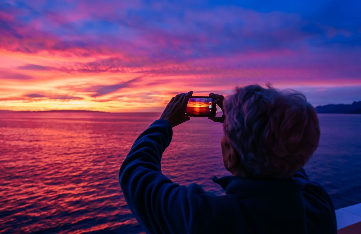 Almost home. Land is in sight as we complete our crossing of the Drake Passage and draw within view of Cape Horn. As sunrise begins to illuminate the clouds, we see the blinking light of the Cabo de Hornos lighthouse. Expedition leader Lucho tells us about the poignant albatross sculpture dedicated to lost mariners and reads us the associated poem in Spanish and English. We are sailing in sheltered waters now, and the sea has reached the balmy temperature of more than 7° C. The seabirds we have learned to recognize in the open ocean–albatrosses, petrels, and prions–are now joined by others, such as imperial shags from Patagonia. Fur seals are once again frolicking near the ship. With formalities complete, there is time for a last series of presentations from our expedition staff, including: a lively account of the world-defining voyage of Ferdinand Magellan by naturalist Madalena Patacho, intriguing ‘Behind the Scenes’ insights into the life of an undersea specialist from Brett Garner, and more about the famous Endurance expedition under the leadership of Sir Ernest Shackleton. After making time for some excellent afternoon Swedish pancakes, we sailed the remaining stretch along the Beagle Channel and came at last to port in Ushuaia. We gathered in the lounge for farewell cocktails with our captain. We celebrated the wonders we experienced over the last ten days, the good friends we traveled with and with whom we shared our discovery of the Antarctic, and the glorious land of Antarctica–the seascapes, history, and wildlife. Where will we travel next? Photo caption: An avian harbinger of the coming day. Photo by Steve Backus