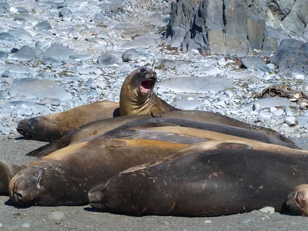 We took a short cruise over to Half Moon Island during lunch, landing on the pebble beaches of the island for either a long hike up the ridge and around the western shore or a direct walk to a chinstrap penguin colony. Those on the hike had exceptional views of the 3,000-foot mountains and tumbling ice of Livingston Island as well as Weddell seals and an aging blue whale jawbone on the southern beach. Chinstrap chicks were well along in their growth rush to fledging size and, like adolescents everywhere, were preoccupied with begging their parents for more food and just a little bit of their own personal space. Come on, mom!