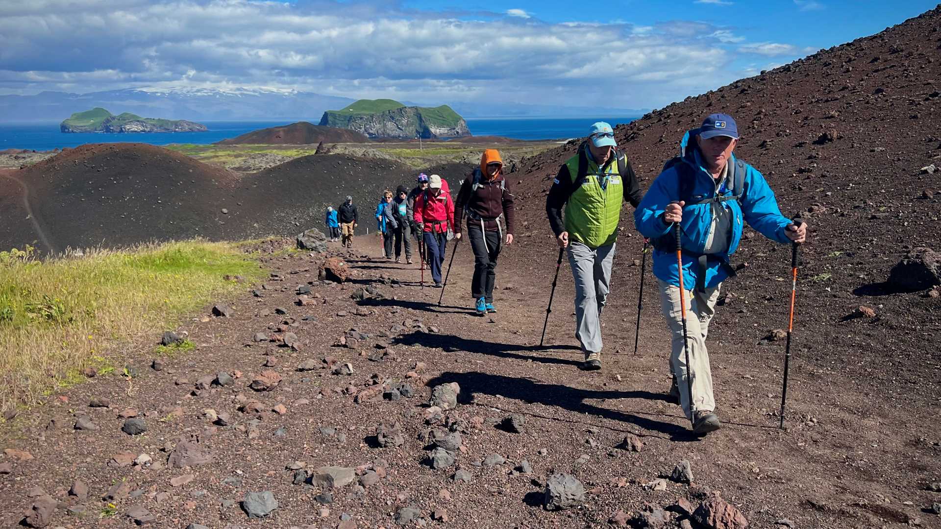 You may not know it, but you’ve probably seen the dramatic Vestmannaeyjar Islands off the south coast of Iceland before. It’s like sailing into an Instagram picture. The uniquely sculpted land is both picturesque and memorable. Heimaey is the most amazing. The harbor here was nearly sealed off by an enormous eruption in the late 1970s that demolished many of the houses in the town at the water’s edge. Today, we climbed the remaining lava pile, still warm from the magma lurking beneath the island’s surface. The blue sky gave us broad views, and the strong winds gave us a true taste of the local life. After dinner, we got a closer look at Surtsey—a volcanic island that is younger than many of us on board. It’s a bittersweet but fitting end to our explorations of the land of fire and ice.