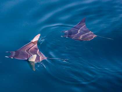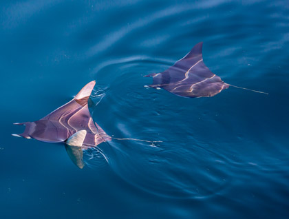 These smaller cousins to the giant manta ray were flipping and flapping all around National Geographic Sea Lion! At about five feet in wingspan, these oceanic rays looked like pop-tarts on steroids as they leaped, flipped, and turned somersault nearly everywhere we looked. The resounding “SLAP” as they hit the water could be heard clearly above our excited commotion as we tried to photograph and call out directions to the latest jumper. Captain Shawn Nettles was able to maneuver the ship near a small group near the surface, allowing us to peer down into the clear water and see the entire body of several of these graceful rays. Magical!