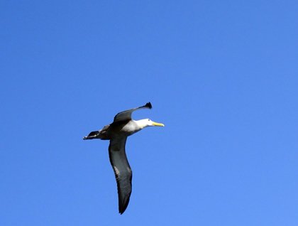 After everybody had returned to our ship, we started the navigation towards the western coast of Hood Island. This afternoon we landed on Punta Suarez, where we went for a long, active hike to observe the colonies of seabirds that nest here, such as Nazca boobies and waved albatross. The albatross only arrived two weeks ago, and a few males were spotted on land, still waiting for their partners. Huge waves crashed along the cliffs, and the sky was full of red-billed tropic birds, albatrosses, and frigatebirds.