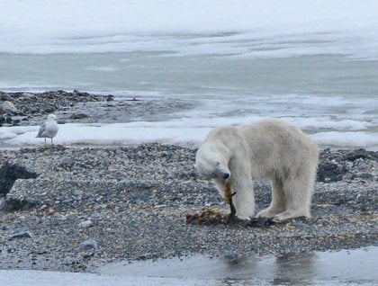 As Hornsund did not have any fast ice throughout the winter, this is not a good place for a seal eating top predator to be. As we followed the bear walking along the beach front we saw it eating seaweed, not a very blubber-rich diet for a polar bear. Summers can be a hardship for a polar bear, which is designed to be on the ice to hunt seals.