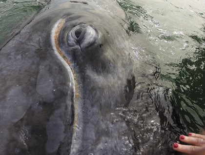 We awakened on our last morning in Bahia Magdalena to fog, slight wind, and the sound of PPffftt…pffft from near and far. The gray whales were all around us, and we couldn’t wait to climb into the expedition landing craft and visit them one more time. After breakfast we did just that. The sun began burning through clouds and fog as we watched gray whale cow and calf pairs come up for breath. Again, miraculously, we found ourselves approached by mom and baby coming in for closer looks at the humans. The first pair we encountered were playful and teasing, baby popping its head above the surface, staying just out of reach and swirling, twirling around mom and our boat. It was fun to watch these antics, and also to watch the whales approach another boat, the distance giving us perspective, a sense of scale, and witnessing the joy of our shipmates’ encounters.