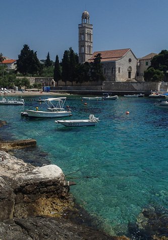 We motored into the enchanted island of Hvar after lunch. The sun was shining brightly and the temperature was in the mid-80s but there was a cool afternoon breeze. Hvar is an ancient place. The present name of the island is derived from the Greek settlers who called it Pharos, the light. The Greeks settled here in the end of the 4th century B.C. The Romans followed the Greeks in the 2nd century and the Slavs came in the 8th century. The architecture of the present city of Hvar is, however, deeply indebted to the Venetians who ruled this entire Adriatic coast from the 13th century until the 18th century. The houses and Renaissance places are made of a luminous limestone.