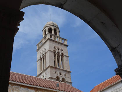 We then anchored off the Pakleni Islands, which shelter the harbor of Hvar, to enjoy a buffet lunch, which included a delicious grilled sea bass obtained fresh from the Dubrovnik Fish Market the previous day. After lunch we took the ship’s tenders to the Riva (the limestone boardwalk) where we were met by our guides for the afternoon, Jana and Dajana, who provided us with our introduction to this charming medieval town. We strolled along the waterfront to the Franciscan Monastery which includes among its treasures an unusual 17th century mural of the Last Supper by an unknown painter of the Venetian school. Some believe that it was Matteo Roselli who having fallen ill in transit was forced to remain on Hvar and was nursed back to health at the monastery. He made the painting as a sort of votive offering. There are several interesting particularities to this painting, including the first appearance of cutlery at the Last Supper, as well as a dog and a cat. Another unusual feature of the monastery is a twisted old cypress tree on the terrace whose trunk has split into multiple directions so that its branches spread out and provide substantial protective shade from the sun. The courtyard of the monastery holds a large cistern which used to be one of the only sources of water for the town and a poster on the doorway announced a guitar concert to take place there the next day.