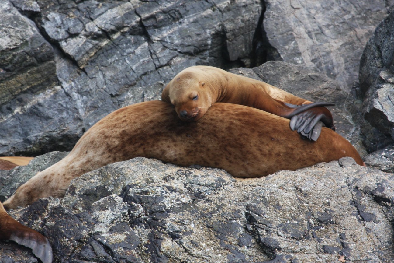 Later in the afternoon we explored the Inian Islands by boat. The Inians are a small archipelago standing right in the middle of Cross Sound and Icy Strait, so the tidal currents that flow among the islands are particularly fierce. But while potentially dangerous, they stir the ocean into a savory broth of astonishing fecundity. It was impressive to see channels flowing like swift rivers, with rapids and swirling eddies. These “rivers” carry salmon and other fish that lure in many a spectacular predator. We saw eagles galore, studding the forest or wheeling over the waves. Sea otters were abundant, sleeping placidly in kelp mats or plunging busily in search of crabs and urchins. But most spectacular were the sea lions. Steller sea lions are the biggest in the world, males sometimes weighing more than a ton. Sea lions sprawled in writhing piles on the rocks, or slumbered in solitary splendor. Others dove for fish, and sometimes we saw them lashing fish to pieces at the surface. Some approached our boats, daring each other to get a little closer. Impressive and entertaining, these creatures are suited to the extraordinary landscape they inhabit.