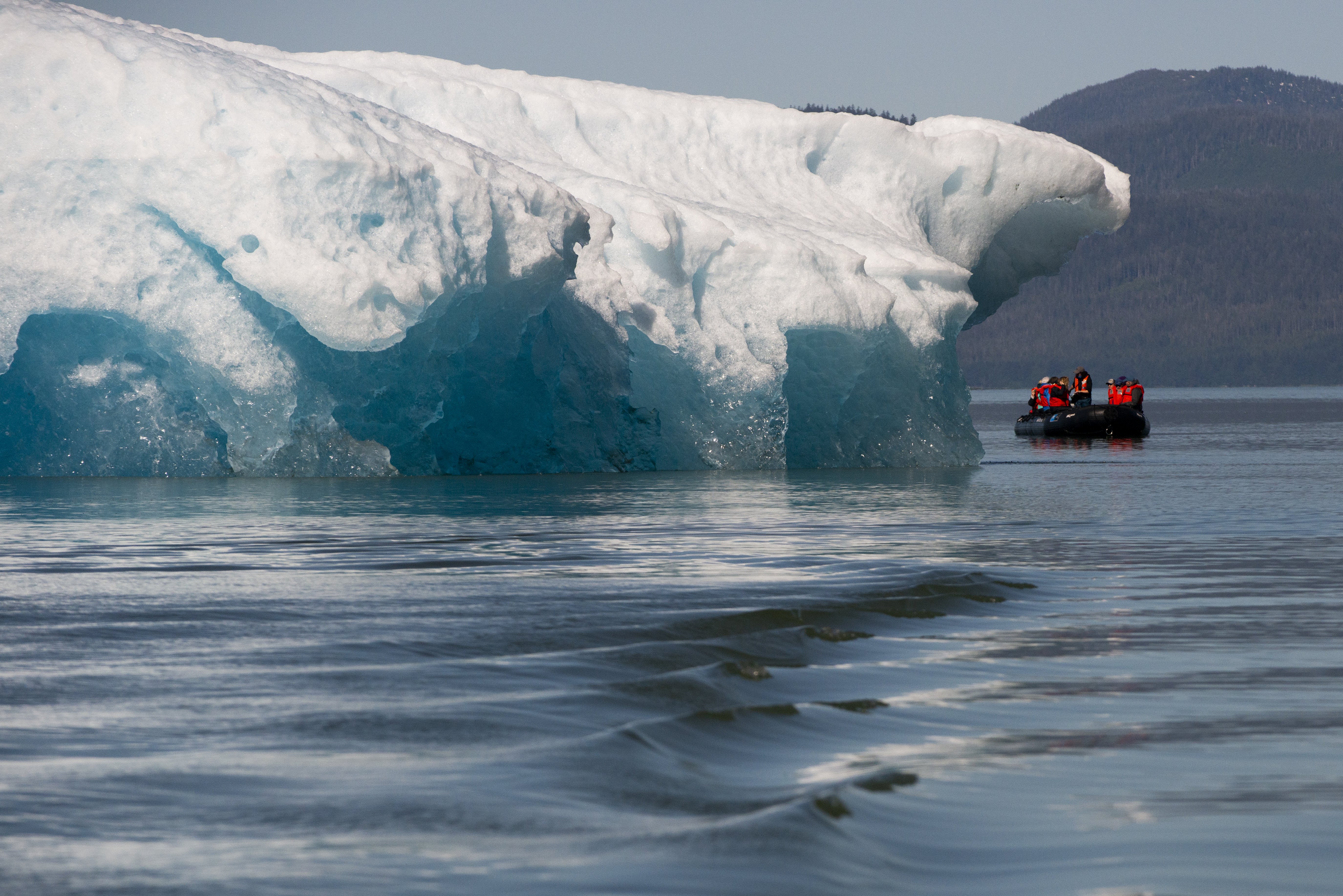 Overnight, National Geographic Sea Bird brought us through Frederick Sound and Stephens Passage from the Kuiu Islands to Holkham Bay. We crossed the bar–an underwater, terminal glacial moraine–at Holkham Bay in the late morning, and we enjoyed cruising through the tall, glacially carved walls of the dramatic Tracy Arm-Fords Terror Wilderness on a rare blue bird day. As we made our way up the fjord, naturalist and geologist Nicole Yamagiwa taught our guests about the glaciology of Tracy Arm from the bow of our ship. Is there any better way to learn about U-shaped valleys, moraines, cirques, hanging valleys, and roche moutonnée than with a geologist holding a whiteboard whilst sailing through the features you are learning about? I think not! It was incredible! A stop at Hole-in-the-Wall Waterfall was an incredible addition to our day. Upon arrival at our heave to location, our able crew lowered inflatable boats to the water, and our team of naturalists and photographers took our guests out by small watercraft to the South Sawyer Glacier terminus to explore icebergs, seals, glacial calving, and even mountain goats! At the end of our day, our guests enjoyed a last dinner aboard National Geographic Sea Bird , followed by a photography slideshow prepared by our photo instructor Lisa Hornak. It has truly been an incredible journey these last six days!