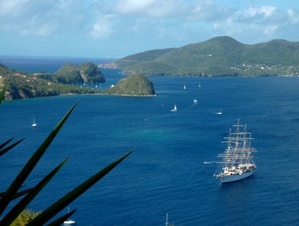 We sailed from Cabritz point Dominica to the Iles des Saintes and anchored about 7 p.m. in the lovely picturesque harbor of the main city in the Iles des Saintes (“The Saints”). The early morning was marked by a little rain but also by the most wonderful double rainbow, which made a semi-circle over the archipelago. The capital of “The Saints” is simply called “Bourg,” or in English the “City.” It is so petit that it hardly qualifies for the name “Hamlet,” but it is picturesque in a remarkably continental French way. The town’s two most imposing buildings are a lovely Catholic Church and a town hall, proclaiming “Liberté, Egalité and Fraternité” those ideals emerging from the French Revolution. The archipelago consists of seven volcanic islands but only two have all year residents. These seven islands along with the much larger island of Guadeloupe comprise the French “Départment of d’Outré Mer.” These islands are a part of France and have approximately the same relationship to the mother country as the Hawaiian Islands have to the continental United States. The inhabitants are French citizens, vote in all elections, and have all the perquisites of being French citizen and a member of the European Union. As such the official currency here is the Euro. And the shops are not inexpensive.