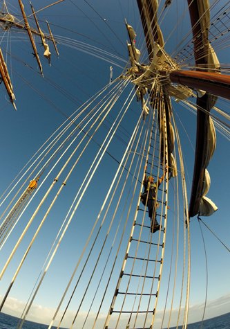 Fort Napoleon contains an ethnographic museum detailing the pre-Columbian history of the islands and a number of rooms devoted to the local craft of shipbuilding. Of particular interest is the illustrated “diorama” of the very important Battle of the Saints (April 12, 1782), where Admiral Rodney of his Majesty’s Government defeated Admiral Comte De Grasse, the leader of the opposing French forces and the visitor of the Battle of Yorktown, which ultimately led to the English defeat in the American war of Independence. The battle took place in these waters and was a route for the French and Spanish fleets who were seeking to capture the British island of Jamaica. After our visit to the fort we took taxis down to the city and spend the rest of the morning freely wandering in and out of the colorful shops. Some of our group went snorkeling at an adjoining island with Mike Greenfelder and Patrycja O’Brien. After lunch the sails went up and we were sailing along at almost 6.5 knots with a nice, fresh wind. Then, I took all interest onto the focsle for a discussion of the sails. As we sailed past the lee of Dominica we were privileged to see a radiant double rainbow. Mike gave a fine illustrated lecture on the fish species of the coral reef and at 6:15 p.m. Tom O’Brien gave a very informative and lively talk on the pre-history and history of the Sea Cloud.