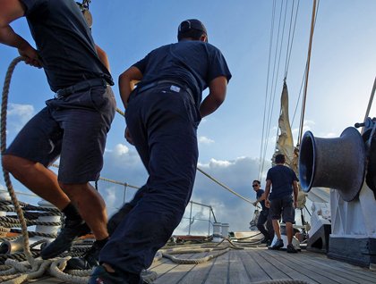 Fort Napoleon contains an ethnographic museum detailing the pre-Columbian history of the islands and a number of rooms devoted to the local craft of shipbuilding. Of particular interest is the illustrated “diorama” of the very important Battle of the Saints (April 12, 1782), where Admiral George Rodney (1718-92) of his Majesty’s Government defeated Admiral Comte de Grasse, the leader of the opposing French forces. The battle took place in these waters, just north of Dominica, and was a rout for the Franco-Spanish fleet that was seeking to capture the British island of Jamaica. After our visit to the fort we took taxis down to the city and spent the rest of the morning freely wandering in and out of the colorful shops shopping. Some of our group went snorkeling at an adjoining island and from what I heard the fish were colorful and abundant. Lunch was on board and the sails went up at approximately 2:30 and we were sailing along at almost 6.8 knots at 3 p.m. with a nice fresh wind. Max gave a fine illustrated lecture on the ecology of the coral reef. We took in the sails at 5 p.m. and at 6 p.m. Tom O’Brien gave a very informative and lively talk on the pre-history and history of the Sea Cloud.