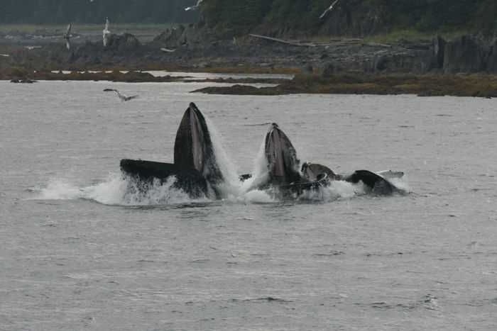 Holy cannoli, what an amazing start to our two-week voyage! This morning inside of Icy Strait Captain Nettles sighted the blows of several humpback whales. The whales turned out to be a group of cooperative bubble-net feeding humpbacks, the gold star for finding whales in Southeast Alaska. We used our hull-mounted hydrophone and heard a faint feeding call moments before the whales broke the water’s surface in unison as they fed on helpless and hapless herring. The visual spectacle combined with the audio supplement made for a delectable start. For the afternoon our expedition watercraft were our vehicle of exploration. The Inian Islands did not disappoint as we found sea otters, Steller sea lions, a plethora of sea birds and magnificent Rapunzel-like fronds of bull kelp. All of this with calm seas and skies that could hold their water. A great start to our voyage that will take us from Southeast Alaska to, ultimately, Seattle, Washington.