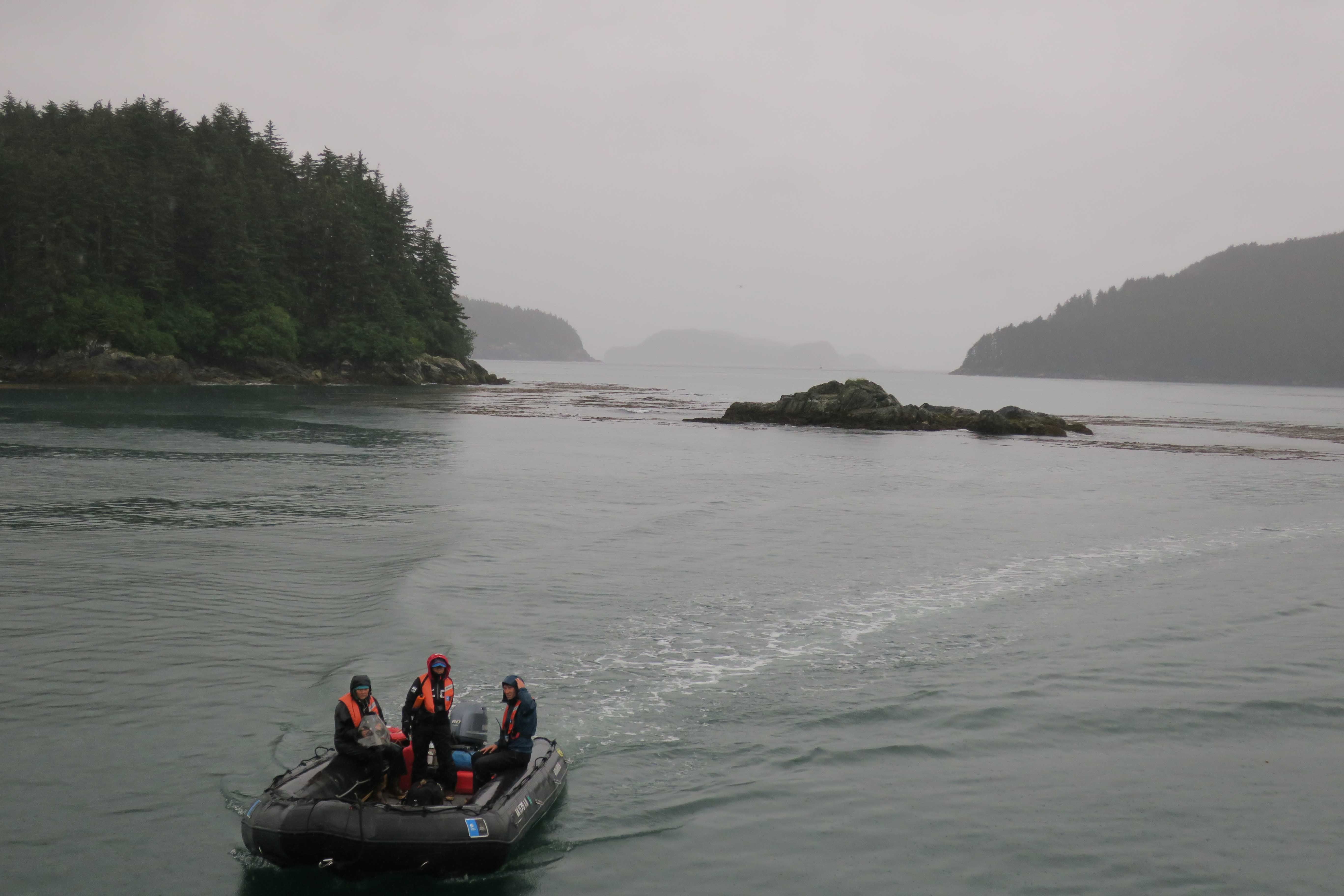 Our naturalist Steve Morello says that rainy weather brings the wildlife out, and Thursday did not disappoint. Before our breakfast of smoked salmon and toad in a hole, the young naturalist aboard spotted a humpback whale, porpoises, and bald eagles off the port deck. We dropped anchor amongst the Inian Islands, within one of the world’s largest protected wilderness areas. Our morning zodiac tour brought us directly face to face with a lively population of Stellar sea lions, who frequent the area for its rich population of salmon returning to the islands to spawn. Sea birds such as mew gulls and cormorants are gathered around the sea lions to feast on the off catch. The sea lions are very curious and popped their heads up while gathering around our boat to see what we were up to. Two males on the rocks were vociferously engaged in a dispute. A short distance away, a population of sea otters was well camouflaged amidst the kelp while feasting on a sea urchin brunch. The rain also brought good fortune. As our group was leaving the area, one of our shipmates spotted the blow of a small humpback whale, just fifty feet off starboard. The whale was gracious enough to present us with a fluke before diving down below. Before returning to the ship, we paid a visit to the Inian Island Institute, a sustainable ecology and experiential education center in Hobbit Hole. Afternoon hikes at Fox Creek on Chichagof Island allowed us to explore the area on foot. Some of our group went on a photo walk and others took a kayak tour of the bay. We discovered perennial bear tracks near a salmon stream as well as a scratching tree and a salmon abandoned in the woods. These tracks, sometimes named “Hot Feet” locally, represent a trail where bears return to step in each other’s footprints. Naturalists think that the hot feet may serve as a pheromone based communication system similar to those that dogs use on their habitual walking paths. After our return, our two Grosvenor Teacher Fellows, Kacy Lebby and Elisabeth Gambino, worked with our young naturalists to microscopically examine the plankton samples collected at Kelp Bay last night. The young naturalists used ship based texts to catalogue and illustrate the zooplankton identified from the plankton tow and presented them to the ship during the daily recap. The evening came to an enjoyable close when local author Kim Heacox came aboard to regale us with songs stories, and to talk to us about his books.