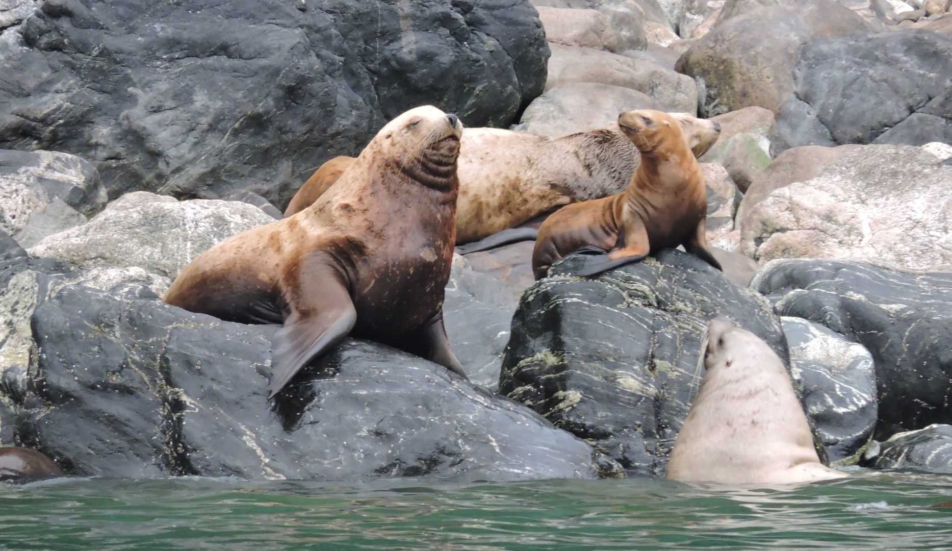 We spent the morning exploring by expedition watercraft and cruising around the Inian Islands. This small island group is central to the northern entrance of Alaska’s famed Inside Passage. Located in Cross Sound, this is an ideal spot to observe marine wildlife, and by that measure we were not disappointed. From the ship’s anchorage near a bay called the Hobbit Hole, a half-dozen humpback whales were sighted blowing in the South Channel. This being realized, our guides took guests in for a closer look. We saw one episode of cooperative bubble-net feeding (a feeding strategy unique to Southeast Alaskan humpback whales), then several more coordinated diving events. When we reached the mouth of the South Channel, we found ourselves facing an assertive incoming tide, which jostled the watercraft with choppy, upwelling waves, whirlpools, and very strong currents capable of reaching as high as nine knots! It was great fun. Better yet was the multitude of Steller sea lions swimming all around us in the swirling currents. These are impressive animals: a full-grown male can approach 2,200 pounds (1,000 kilograms), which is considerably larger than a coastal brown bear (Figure A). Many of them came quite close to the boats and several were observed catching and eating fish (Figure B).