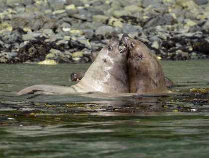 The fog horn could be heard throughout the National Geographic Sea Lion as she made her way toward our morning destination of the Inian Islands. This small group of islands marks the entrance of Cross Sound where much of the northern tidal waters enter Southeast Alaska from the Pacific Ocean.  Tidal ranges in Southeast Alaska can reach changes of over 20 feet of water moving through a very narrow entry causing phenomenal current, standing waves and many circling eddies. The current moon was moving towards a new moon, nearly halfway, which provided for a more gentle tidal change, a blessing for all Zodiac drivers!  Our morning was spent in our inflatable crafts exploring the nutrient rich waters of the passages in and around the Inian Islands.