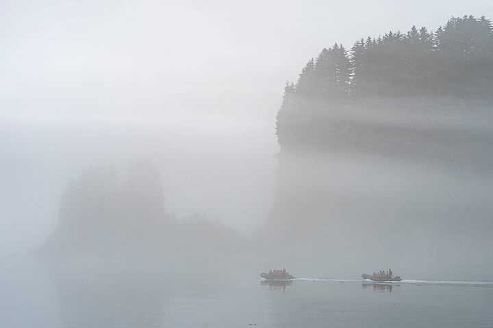 National Geographic Sea Bird sailed through Icy Straits in early morning surrounded by a thick fog. As we anchored in the Inian Islands, we could hear humpback whales breathing somewhere out in the fog. Nearer to the ship, we saw sea otters floating by lazily. After a hearty breakfast, we boarded expedition landing crafts for a cruise around the Inian Islands.