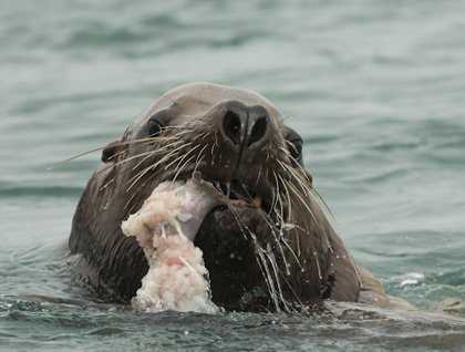 As the strong currents collide with big rocks and underwater promontories flow upwards, bringing large numbers of fish close to the surface and numerous creatures take advantage of the opportunity. We had a marvelous time watching the great abundance of marine birds, including black-legged kittiwakes, pigeon guillemots, and bald eagles capturing small fish at the surface or picking up fish scraps that Steller sea lions left behind. The Steller sea lion is the largest sea lion species in the world and a powerful swimmer, capable of moving at ease around the extremely fast current to capture large fishes. Today we all had the chance to watch many of them coming up to the surface with big fishes in their mounts and then shaking them violently in the air, trying to break them into smaller pieces they could swallow. The sight of such a powerful animal creating havoc at the surface and attracting many hopeful birds towards him is something not easily forgotten!