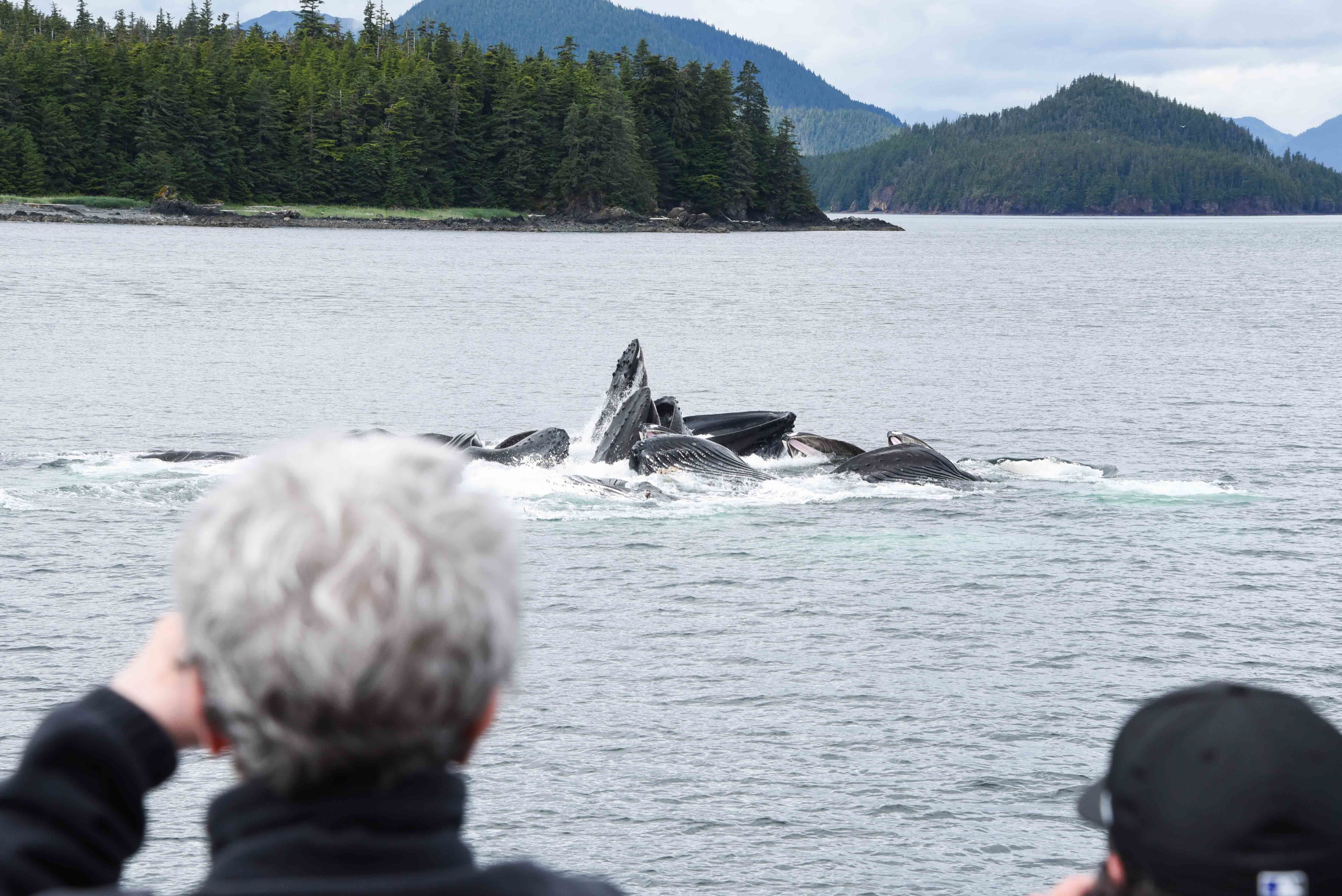 Our final day aboard National Geographic Sea Bird began in Pavlof Harbor. The first coastal brown bear we sighted was a lone juvenile resting at the mouth of the stream, nestled amongst the rocks. We slowly headed to the falls to find a burly adult stalking salmon in the middle of the stream. As the season winds down, these bears are over double their spring weight. While they have been foraging all spring and summer on sages, grasses, berries, and more, the true calorie loading comes from their end of summer salmon feast. Every few minutes, this adult caught yet another salmon, only to gorge on the brains, eggs, and skin. The remaining bits are too muscly for the bears. Strolling along the edge of the stream after its nap, the juvenile joined in the salmon feast. While the adult patiently stalked its next salmon, the juvenile was less patient, often losing focus and staring around. It even appeared to avoid getting too wet by sitting, frog style, on a middle rock. A few minutes into our second round of bear sightings, we observed as a mother and two cubs approached! One quick swipe in the water, and this momma bear caught her first female salmon. She took a clean bite of the tail end, and out poured fresh salmon roe. The two cubs pushed in for a share of mom’s catch, each taking a chunk of the skin for themselves as well. While mom was willing to share, it seemed like one of the cubs was quite talented in the art of fishing. After a few tries, this new cub had already caught its first salmon. With a look to the right, the juvenile was still sitting above the rock, maybe afraid to intervene, or perhaps less of a hunter. Either way, the bear sat, still looking around and waiting for an easy target. We began this week with glacier carved fjords, stunning and close views of glaciers, and moments with marine mammals. We completed our journey at the stream along with the salmon. They come here to spawn and die, and their nutrients are recycled into the forest and animals around us. With such documentary worthy moments captured in our memories and in our photos, we headed back to the ship with an overwhelming sense of awe. I know that you are probably thinking nothing could make this day any better. Alas, this is Lindblad, and during the afternoon, we cruised the area in search of humpback whales. A few hours into our search, we found a relatively fast group of bubble-net feeding whales. With their surface feeding visible from the bow, naturalists and guests alike were shouting for joy. Later in the evening, we identified four of the six whales we sighted, learning that most of them have been sighted migrating to Hawaii for the winter. The evening closed with one final recap, our guest slide show, and conversations into the twilight. I could not think of a better send off from our time here in Southeast Alaska. Until next time! Photo caption: Visiting Pavlof Harbor and Chatham Strait.